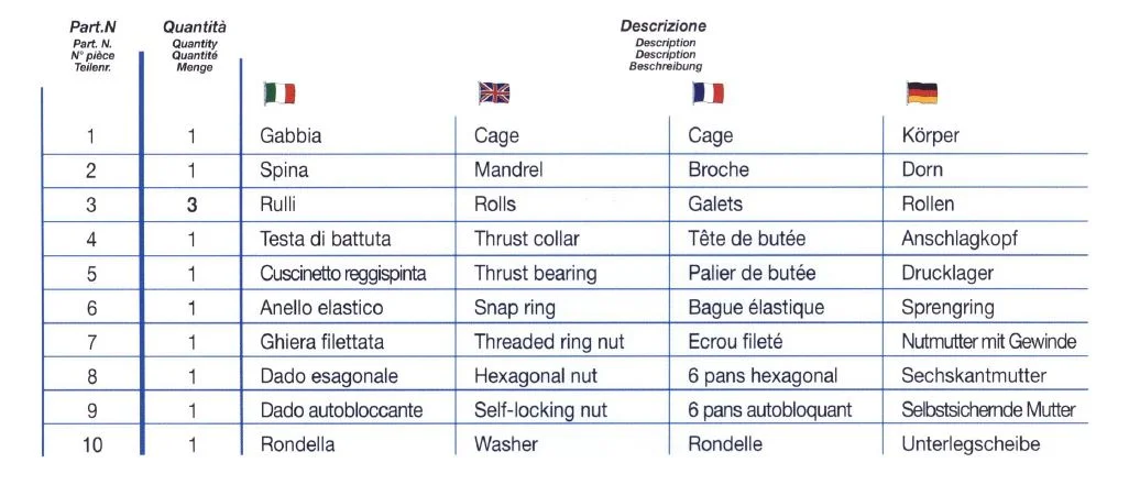 1.) Körper (auch Käfig), aus gehärtetem Stahl mit Fenstern für die Rollen. Der Gewindeteil