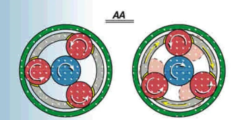 Die Rollen drücken beim Aufweiten in Pfeilrichtung (grün), der